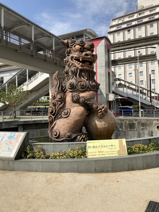 牧志駅前にある高さ3.4メートルの「うふシーサー」国際通りのシンボルの1つです。国際通り散策された際はぜひご覧くださいね。