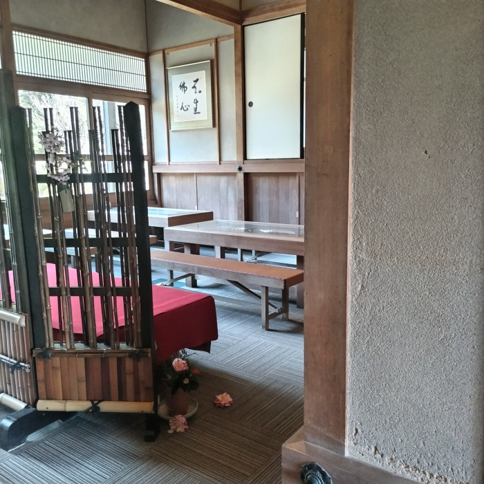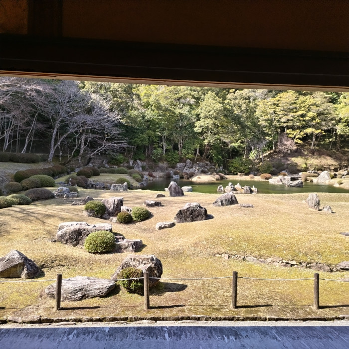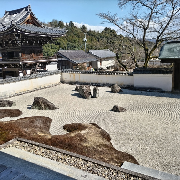 お寺の中庭には南溟庭とよばれる枯山水のお庭がある。こんな立派なものが片田舎にあるのが不思議な気持ちになります。こちらは昭和の作庭家・重森三玲氏の作で、重森氏が荒廃していた雪舟庭を復元作業(同年山口県内の宗隣寺も修復)にあたった昭和四十三年(1968)作庭されたとのこと。