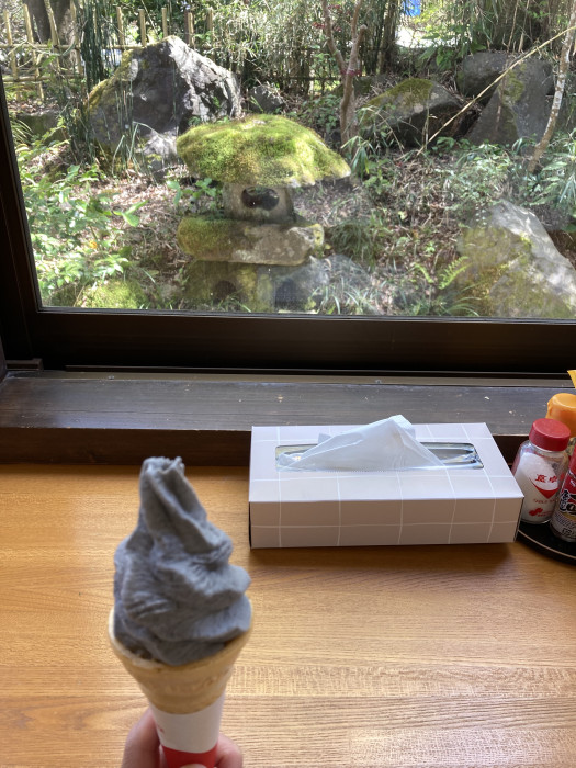 散策後は駐車場前にある食事処「西丸」にて、黒胡麻ソフトを食べながら小休止。
