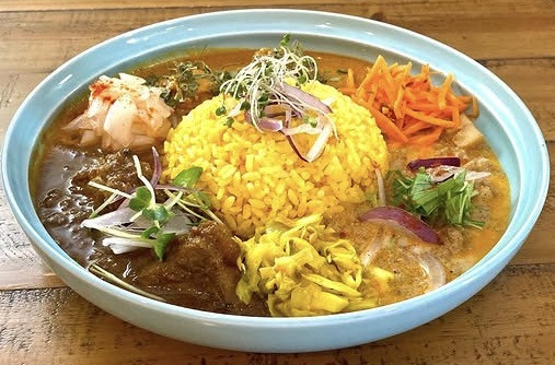 那覇市(ゆいレール安里駅すぐ近く)にある「ヤマナカリー別邸」で3種類のカレーと副菜がワンプレートにのった「三盛カレー」(1,550円)をいただきました。チキンカレー、エビが入ったココナッツカレー、石垣牛すじが入ったルーローカレーです。特に石垣牛すじカレーが絶品‼︎牛すじの旨みと甘辛くスパイス感がほどよいルーロー飯風のルウ。ご飯が進む!進む!