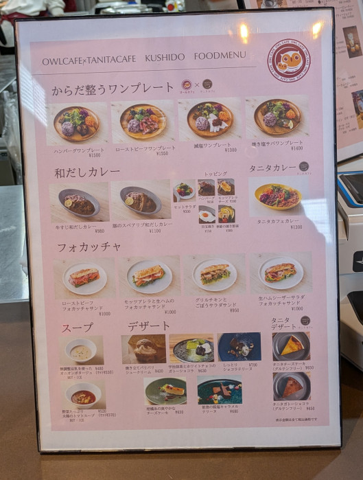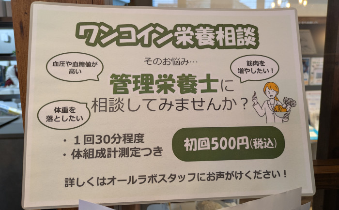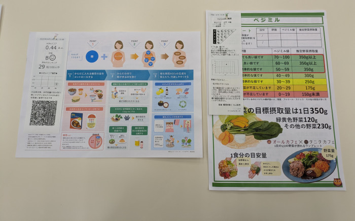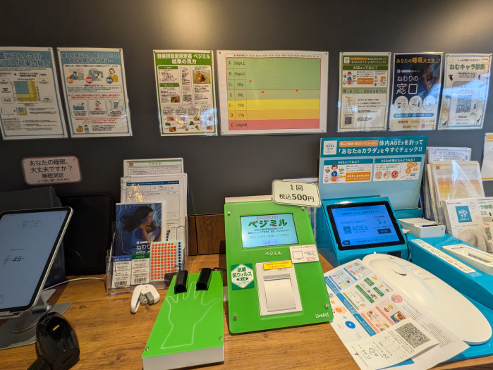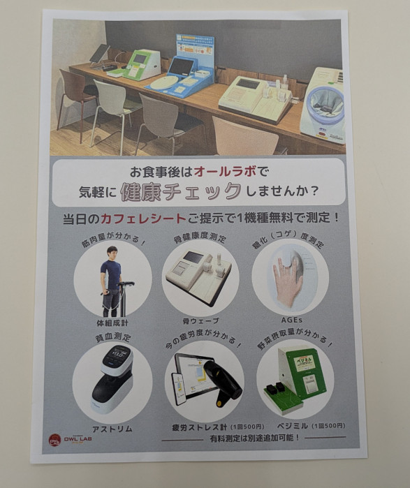 そして、このお店ならではのユニークなサービスも。カフェのレシートを提示すると、健康チェックを1項目無料で受けることができます。内容は骨密度や筋肉量、血糖の状態、貧血傾向、疲労ストレス、さらには野菜摂取量までと幅広く、ちょっとした健康診断のような感覚。食べるだけで終わらず、自分の体の状態を知るきっかけになるのは、医療複合モールならではの魅力です。